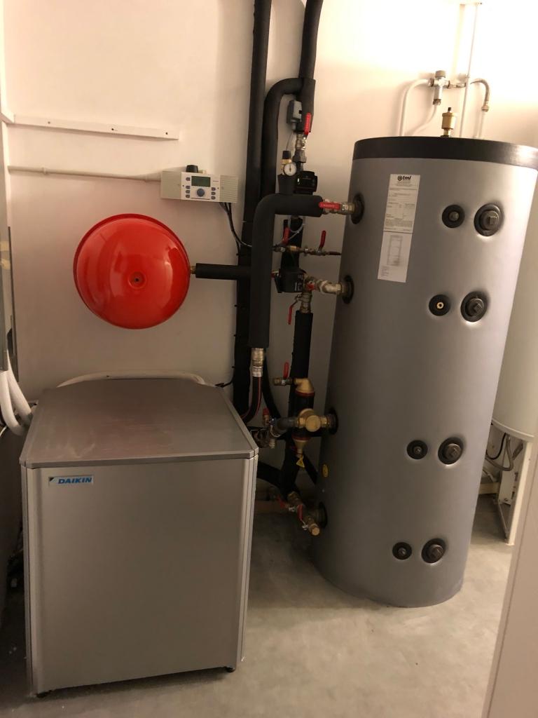 La pompe à chaleur DAIKIN 14 KW assure le chauffage de la maison par l'intermédiaire d'un ballon tampon et d'une régulation en fonction de l'extérieur, (système entièrement automatique).