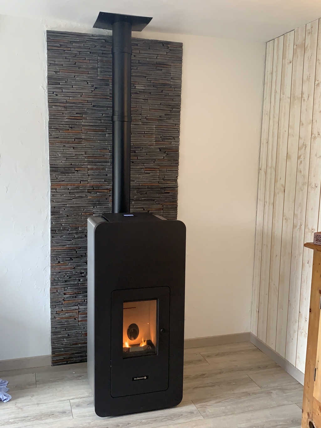 Installation d'un poêle à granulés dans le séjour. L'évacuation des fumées se fait par ventouse. Le poêle est étanche prenant l'air de combustion à l'extérieur et évacuant les fumées par l'intermédiaire de conduit double paroi. Le poêle est modulant grace à une sonde qui annalise et adapte la combustion à la qualité du combustible. Chambre de combustion entièrement garnie de plaques réfractaires vermiculite et vitre en verre céramique. Fonctionnement automatique, avec module de commande placé sur le dessus. extrêmement silencieu.