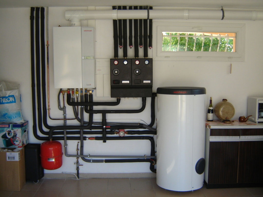 Chaufferie avec une chaudière condensation Weishaupt à condensation, un préparateur d'eau chaude sanitaire et deux modules de régulation alimentant un plancher chauffant et un réseau radiateurs.