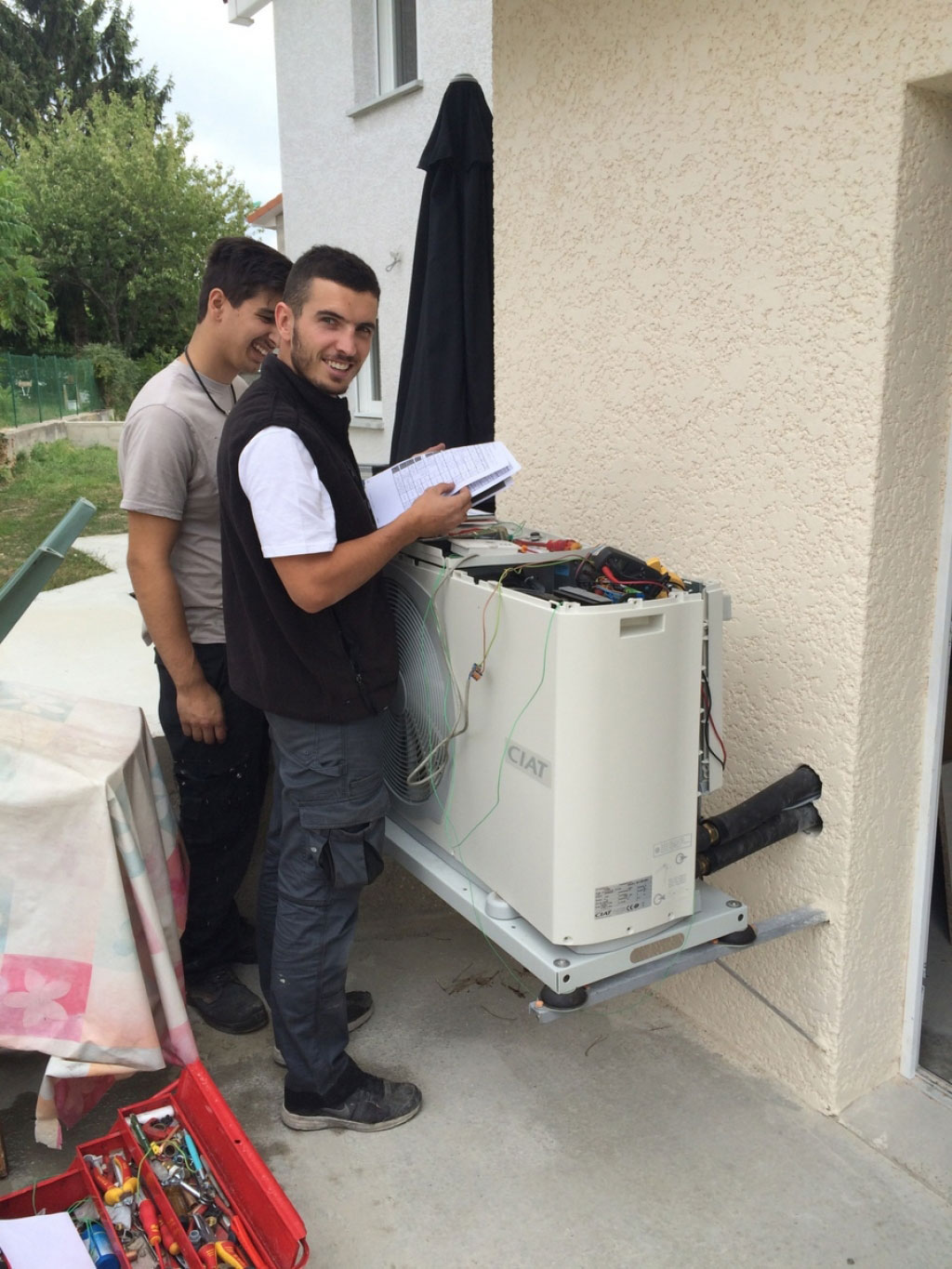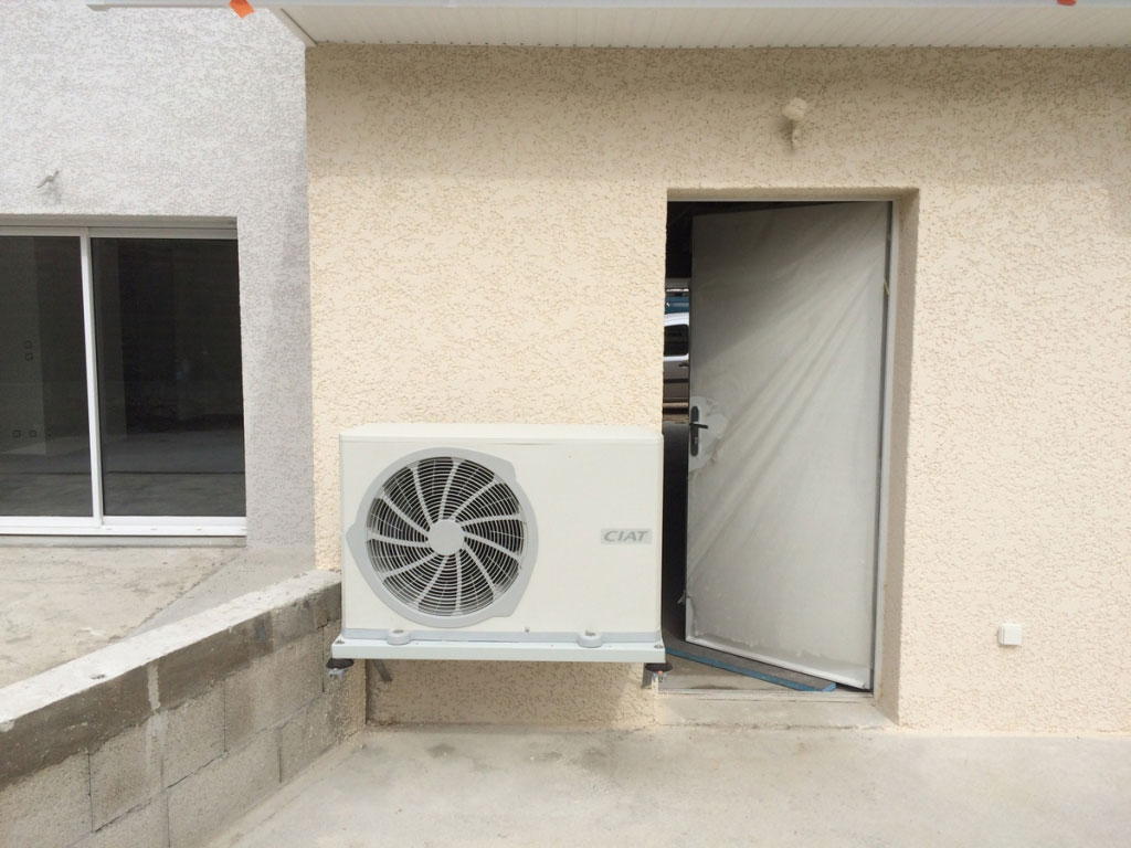 Installation d'un pompe à chaleur Monobloc extérieur pour le chauffage et la production d'eau chaude de la villa. Le chauffage est dissipé par un plancher chauffant RDC et des ventilo-convecteurs à l'étage à Chavanoz 38 Isère Région Rhône-Alpes-Auvergne