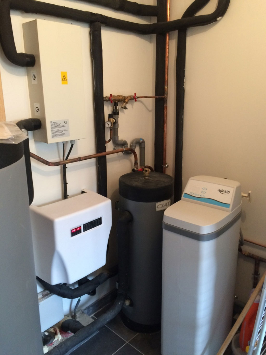 L'eau chaude sanitaire est accumulée dans un ballon de 300 litres. Elle est chauffée en priorité par la pompe à chaleur et l'appoint se fait par les résistances électriques au tarif de nuit.