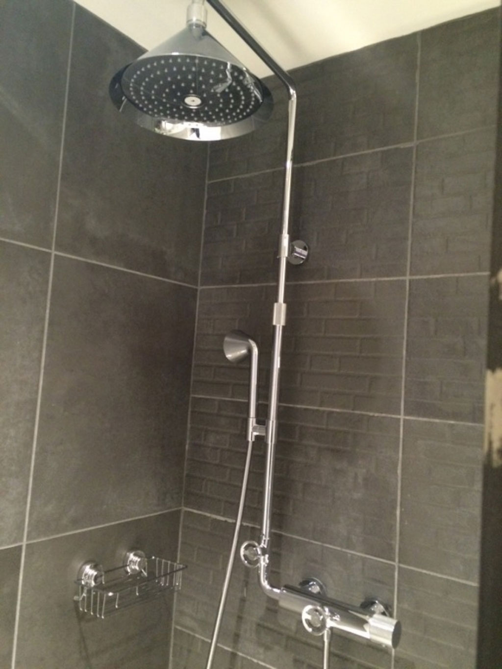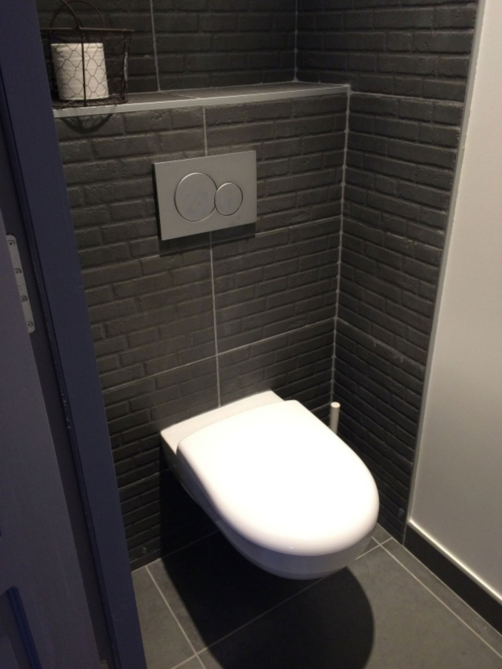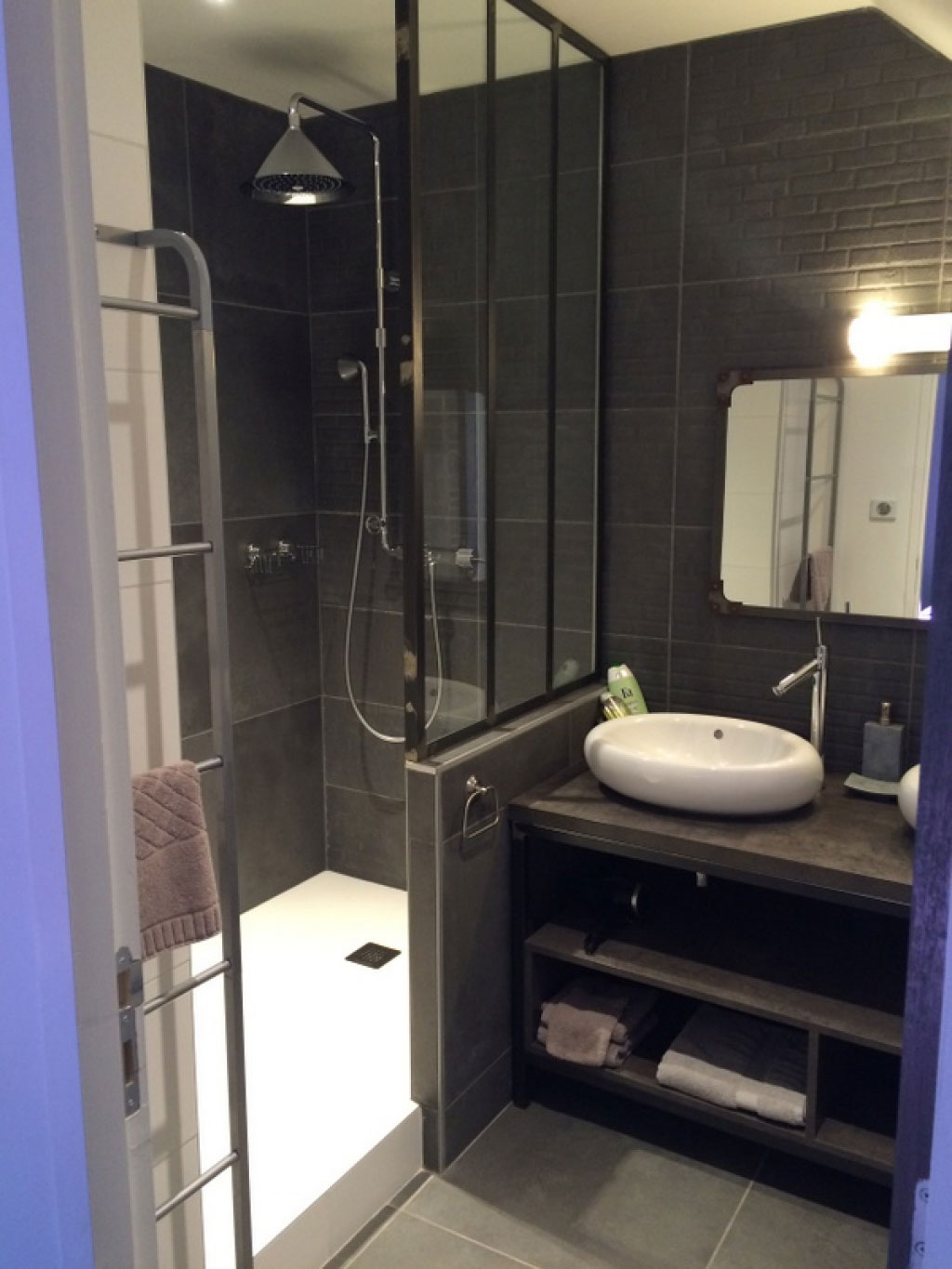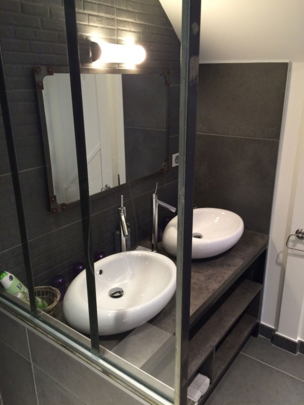 Ancienne propriété agricole rénovée en chambres d'Hôtes à Villette-d'Anthon 38 Isère Région Rhône-Alpes-Auvergne. La toute dernière chambre mise à disposition de leurs clients est familiale et est équipée d'une salle de bains et d'un WC dissociés. La salle de bains familiale réunit des sanitaires en grès et du fer forgé à l'état naturel. Les vasques ovales et les mitigeurs de chez Brossette sont installés sur un meuble en fer forgé avec un plateau en bois entièrement confectionné par des artisans. Les équipements sanitaires, robinetteries et autres confèrent à la chambre familiale un style qui lui est propre. Dans les chambres d'Hôtes, tous les WC sont des WC suspendus, équipés de bati-supports GEBERIT.