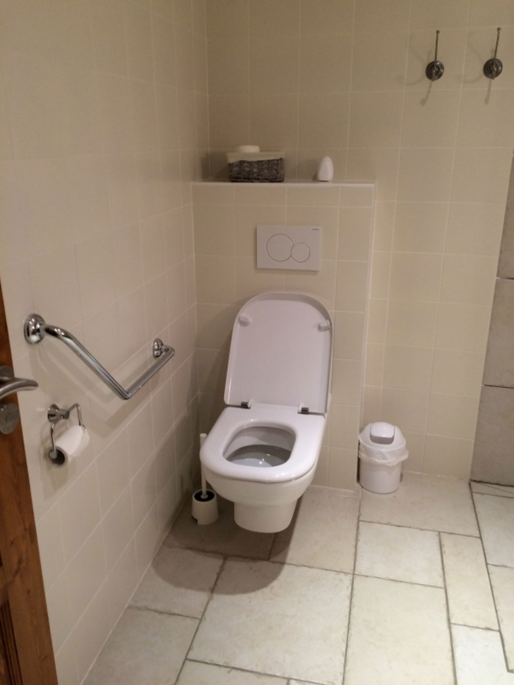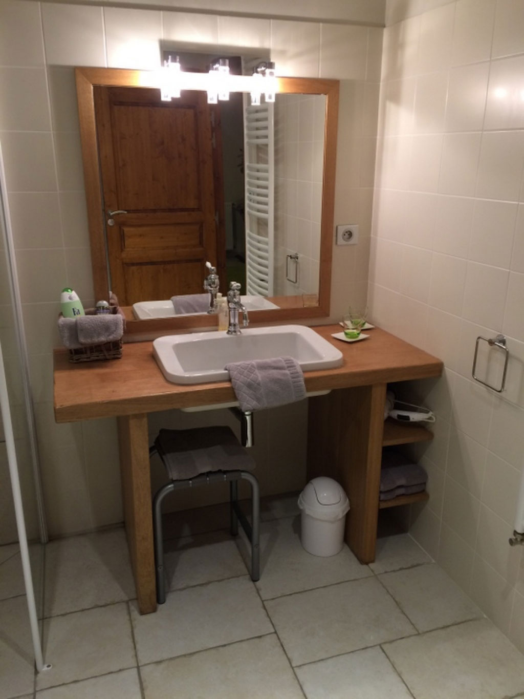 Dans cette chambre le meuble de salle de bains est ainsi de conception artisanale, nous avons encastré la vasque en respectant les normes handicapées. Le WC suspendu est aussi une cuvette spécifique rallongée avec les accessoires de relevage nécessaires.