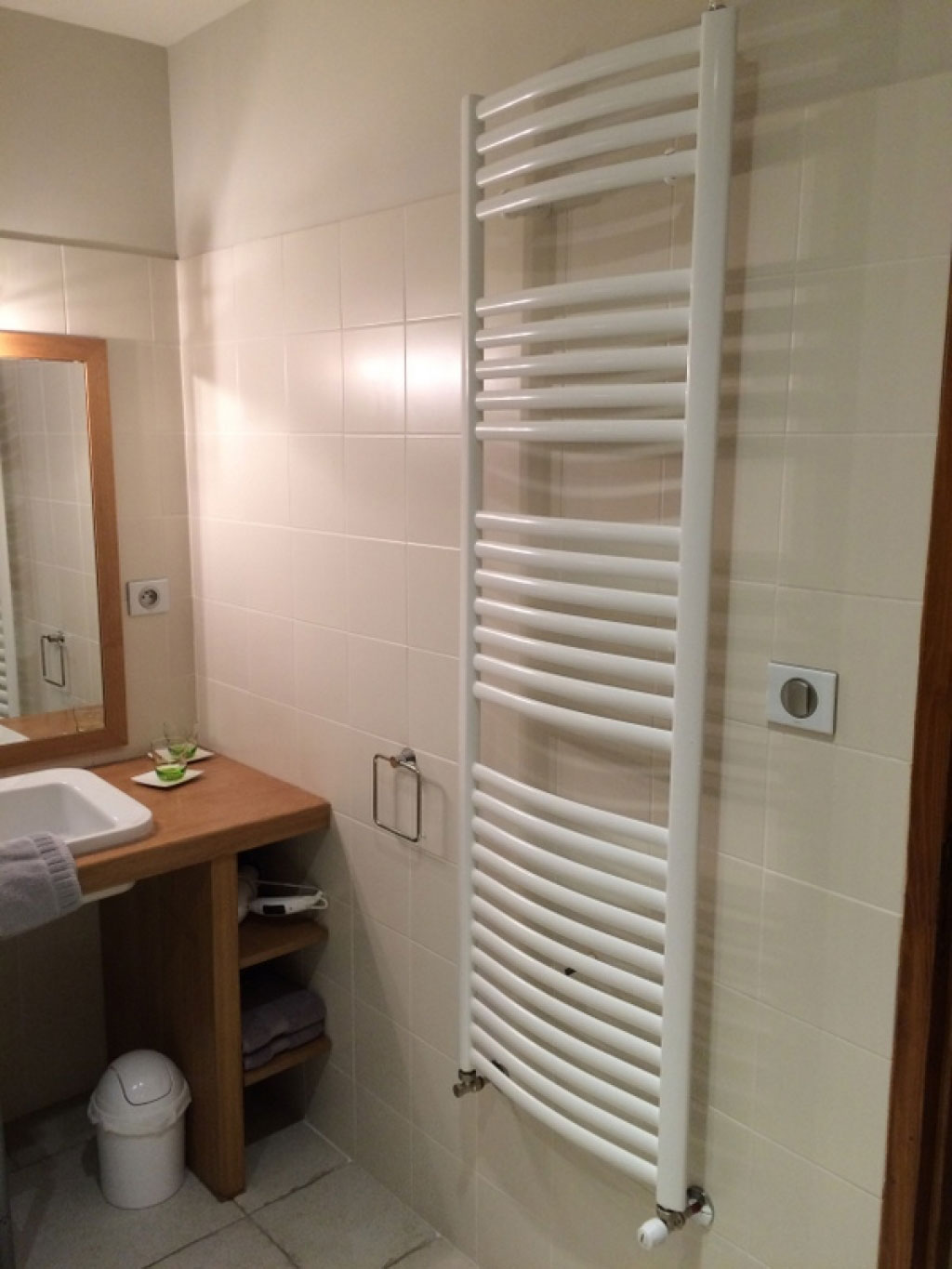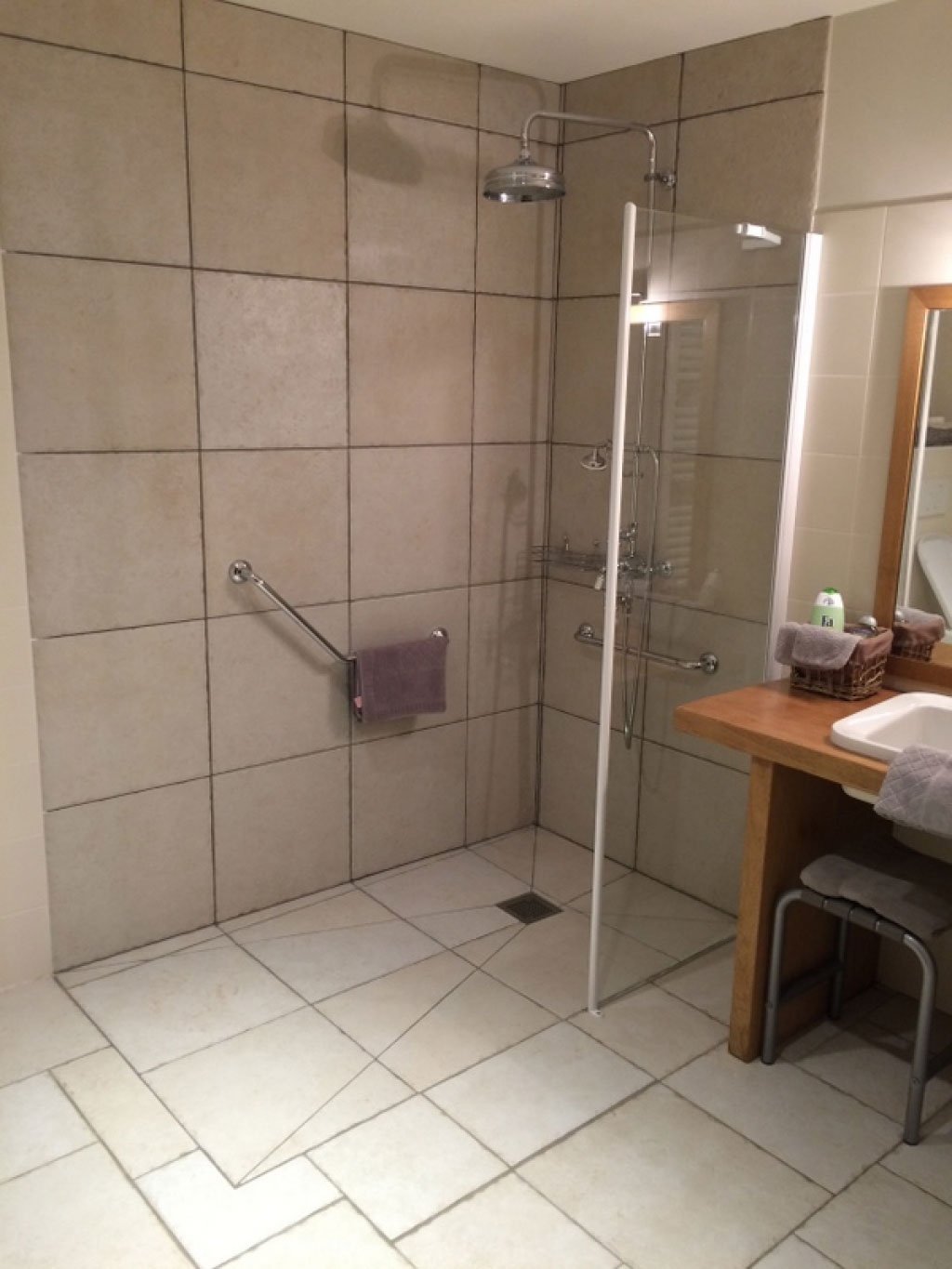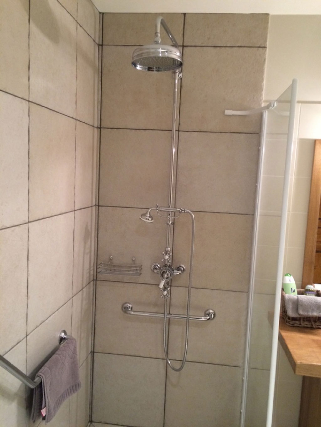 Lors de la rénovation, le Maître d'Ouvrage a apporté une attention toute particulière à l'accessibilité du bâtiment aux personnes à mobilité réduite (PMR). Ils ont donc conçu une chambre d'Hôtes spécifique avec une salle de bains que nous vous présentons ici. Tous les sanitaires, robinetteries et équipements ont été choisis pour un confort d'utilisation optimal avec le souci d'un style spécifique, campagnard. La douche à l'Italienne est carrelée et spacieuse. Installation à Villette-d'Anthon 38 Isère Région Rhône-Alpes-Auvergne.