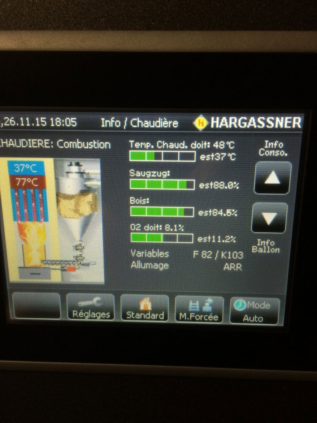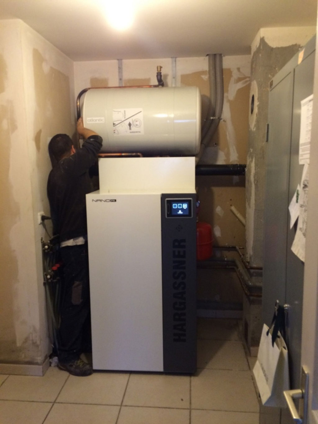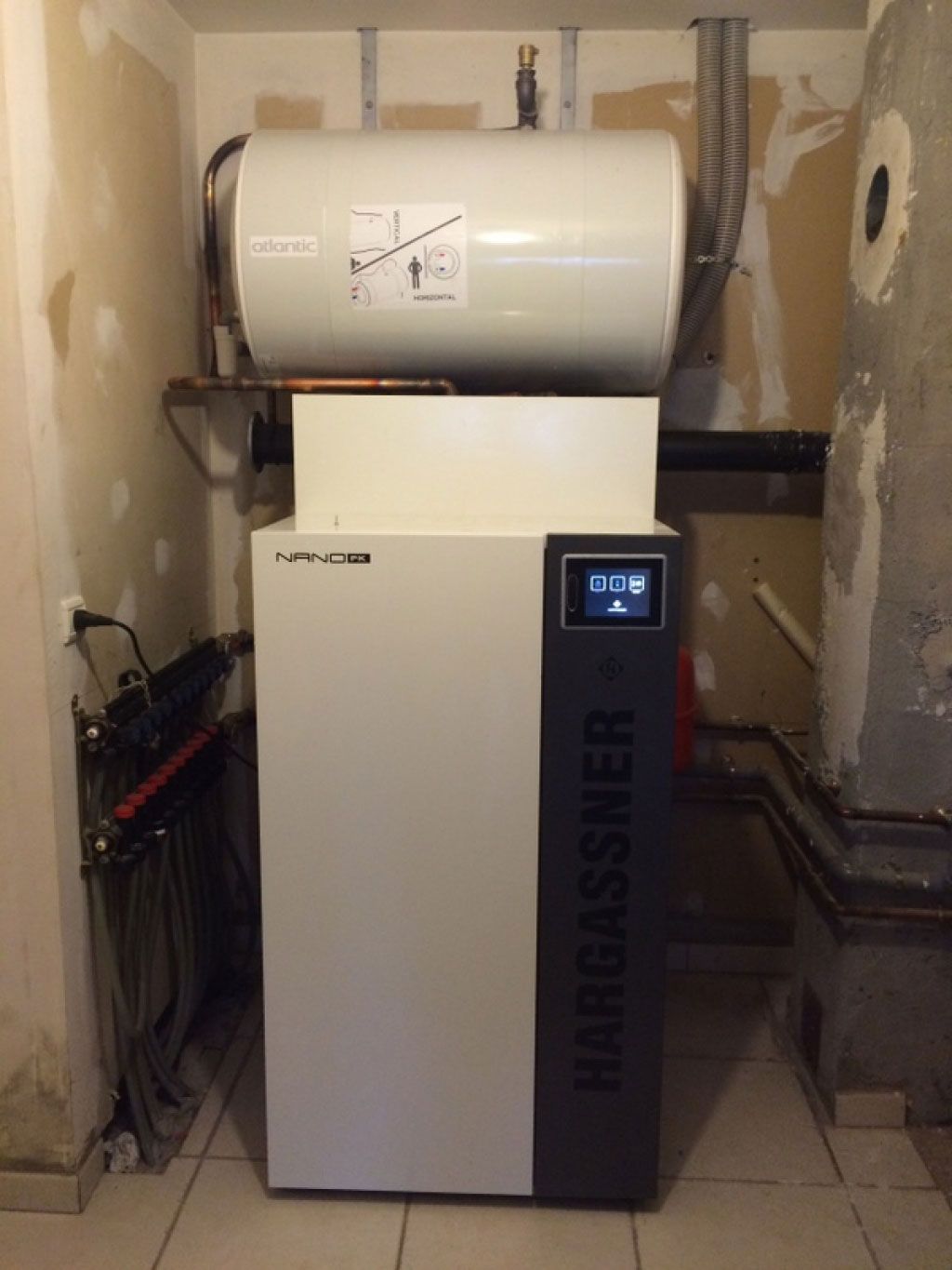 Installation d une chaudière à granulé de bois (pellets) Hargassner à Villette-d'Anthon 38 Isère en remplacement d une chaudière fuel pour le chauffage par plancher chauffant et la production d eau chaude sanitaire d une villa de 140 m2.