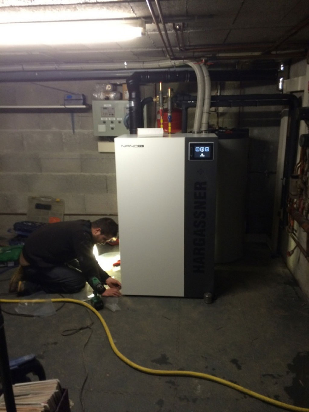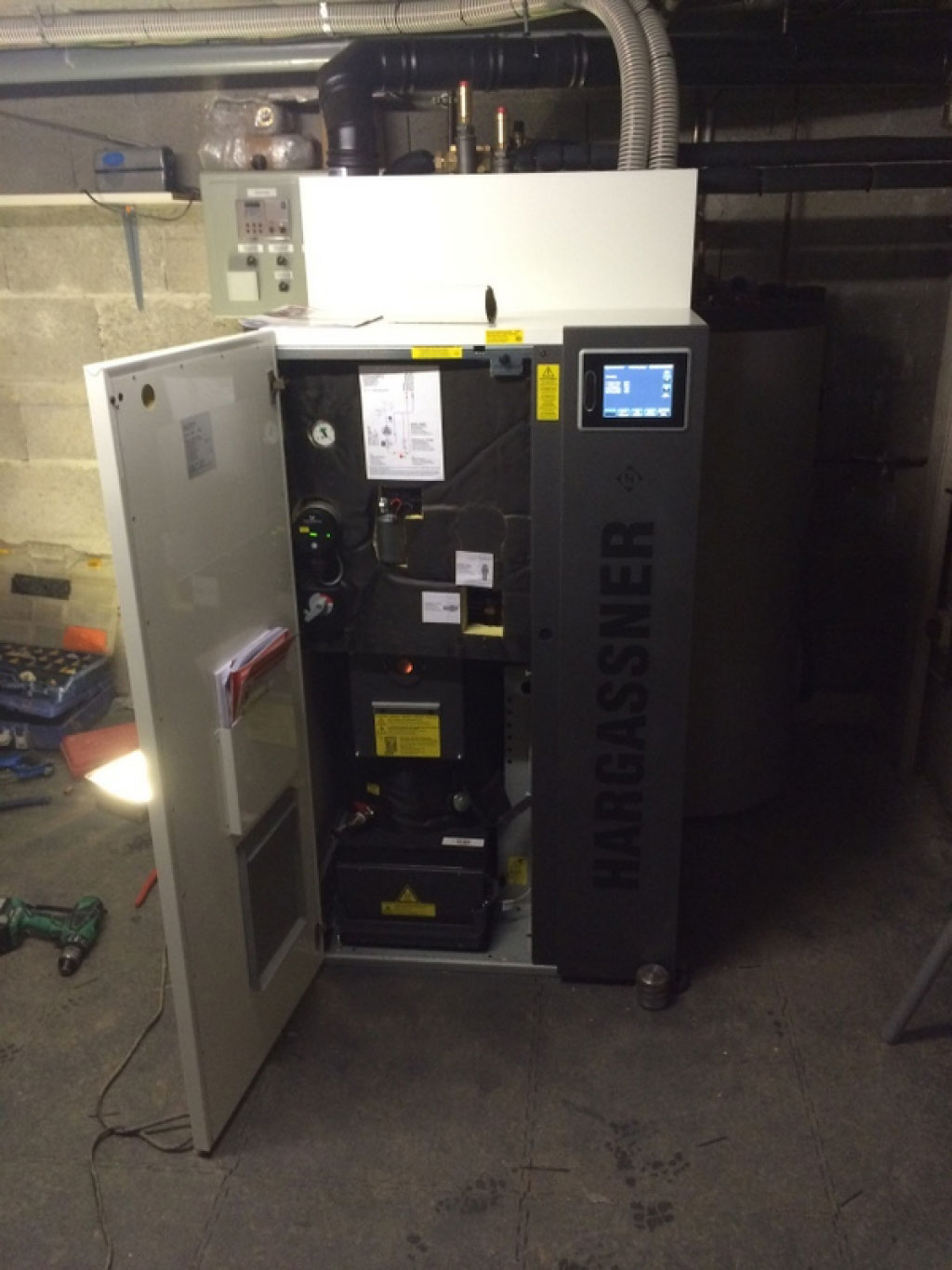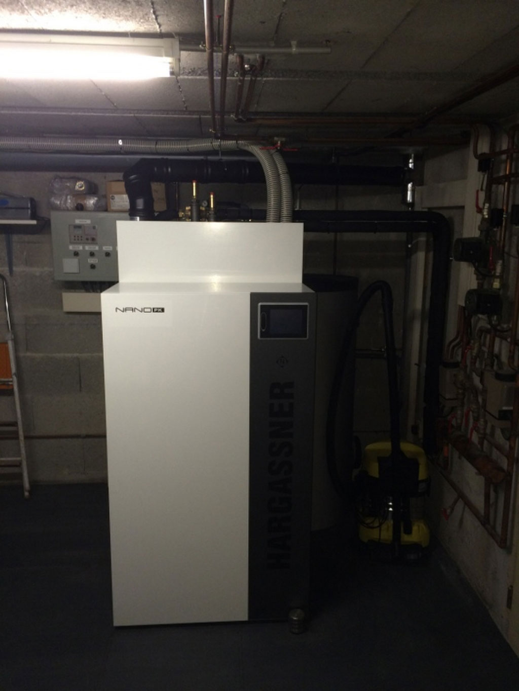 Chaudière Hargassner NANO à granulés (pellets) à Jonage 69 Rhône en remplacement d'une chaudière fioul PERGE. La NANO a un encombrement minimal, elle intègre toutes les performances des chaudières Hargassner grâce à une technologie de pointe pour un maximum d'économies de chauffage.