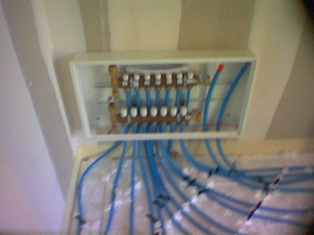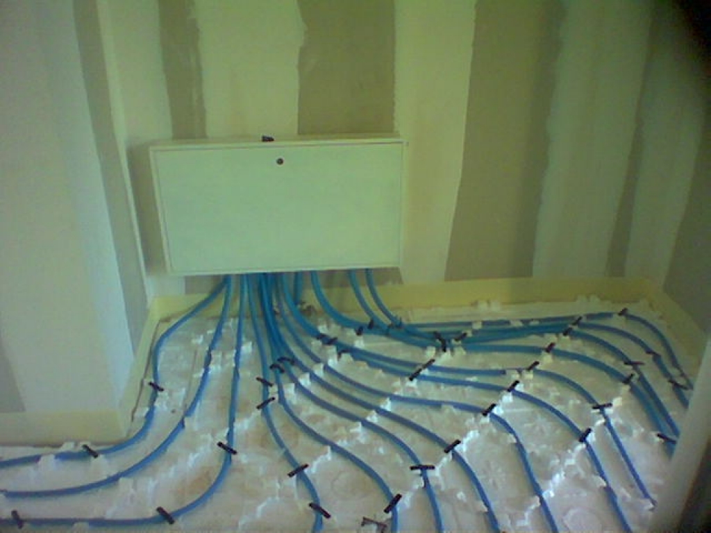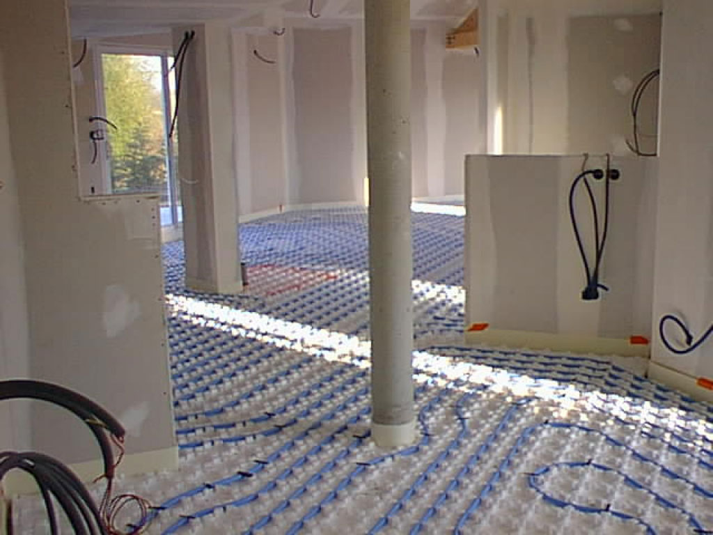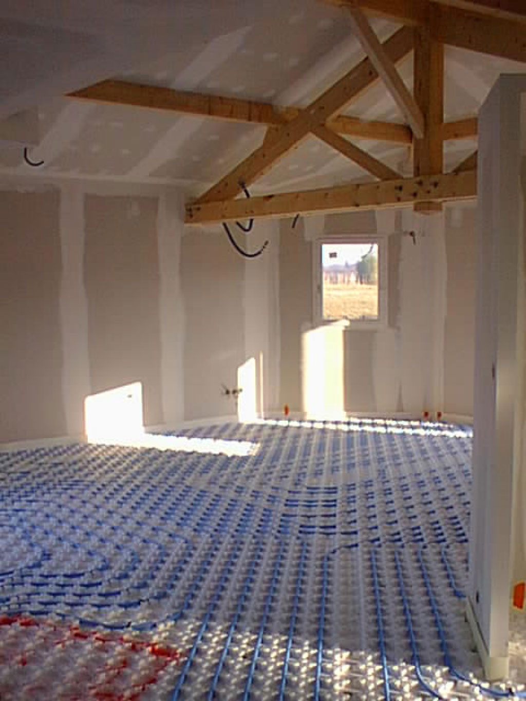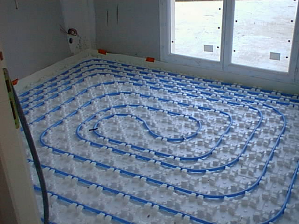 Plancher chauffant Acome à Monthieux 01 Ain Région Rhône-Alpes-Auvergne, avec des dalles en polystyrène compressé prévu pour le maintien en place par des plots du tube polypropylène. Le plancher chauffant permet de chauffer des pièces à hauteur sous plafond élevée d'une manière économique. Les nourrices souvent installées dans les placards ou pièces techniques peuvent être intégrées dans des coffrets de finition.