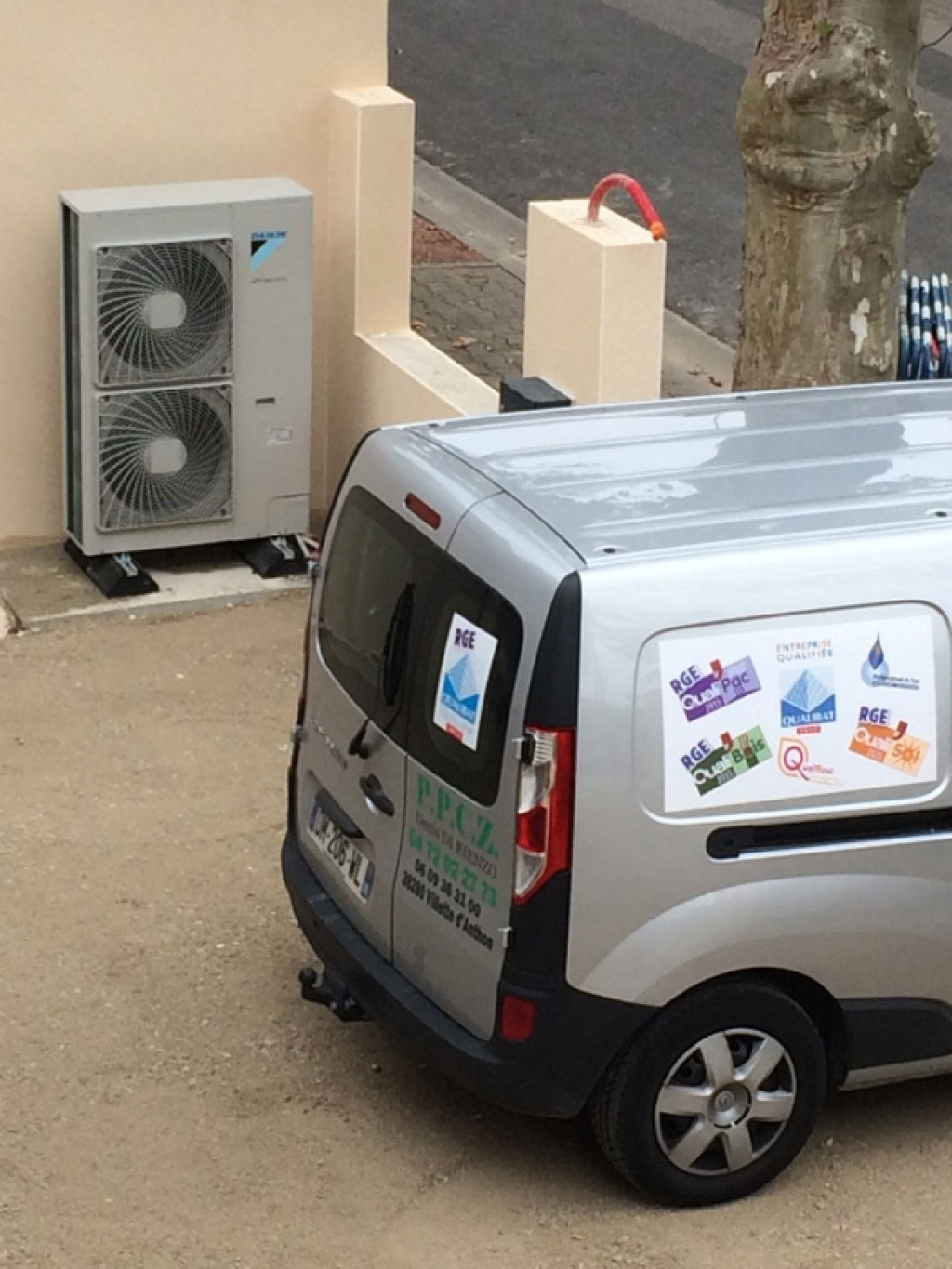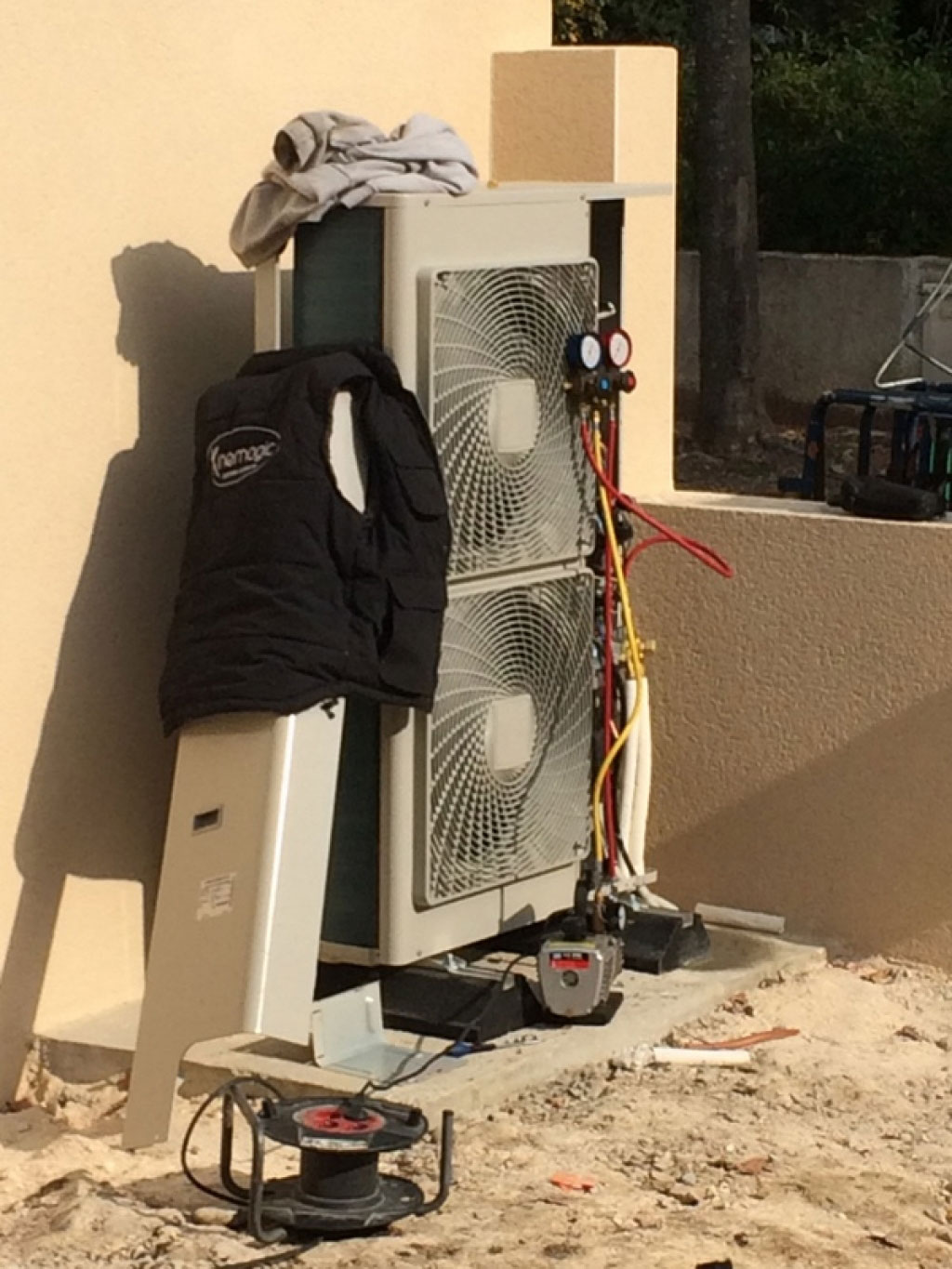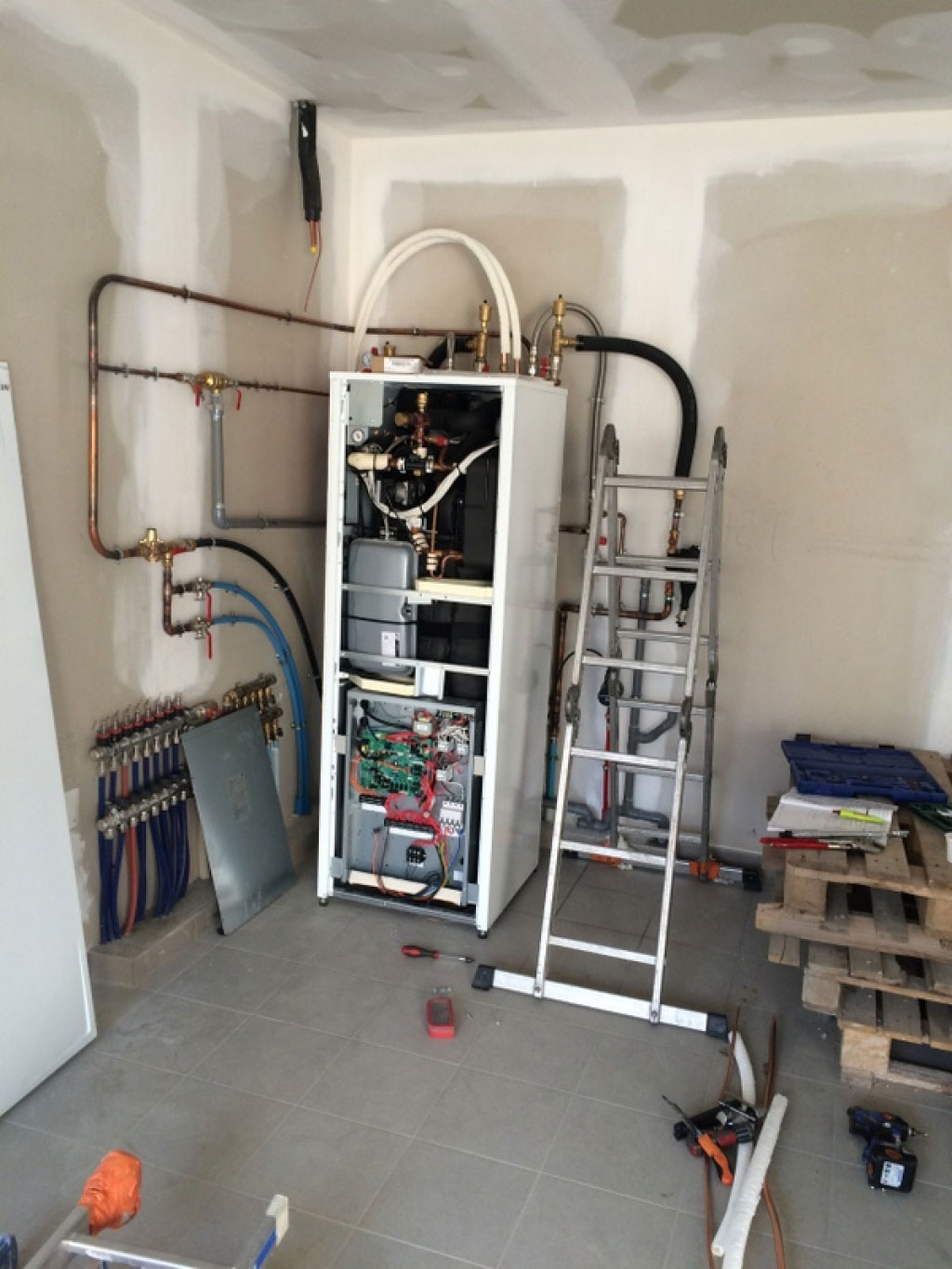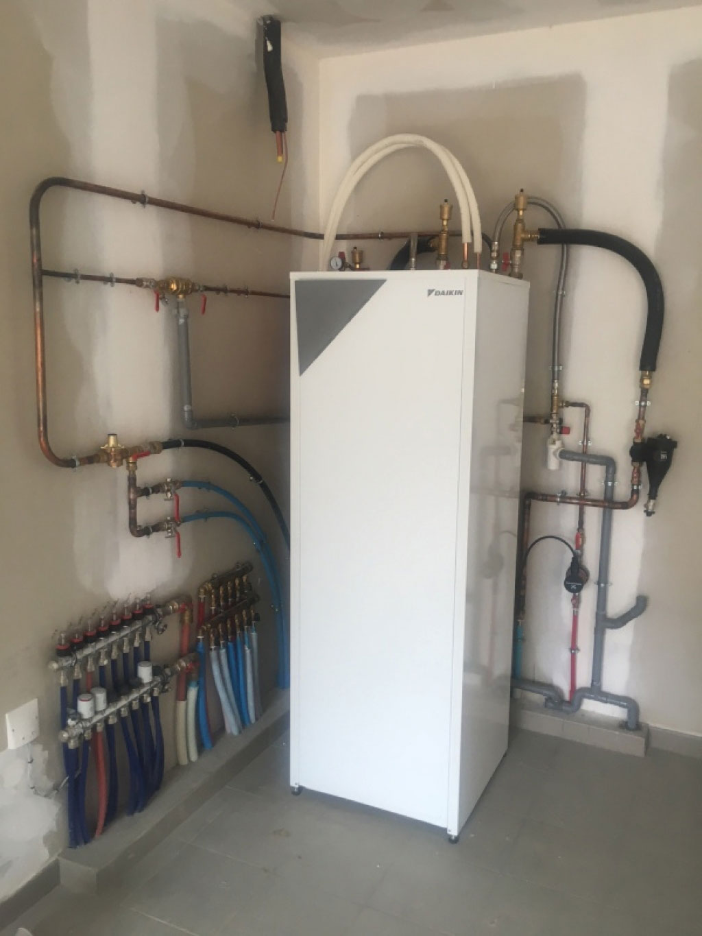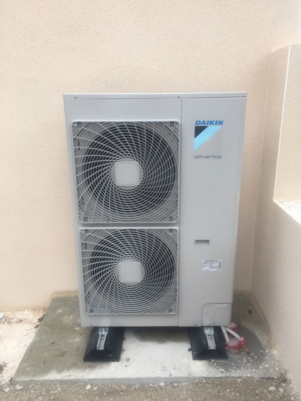 Installation d'une pompe à chaleur Aérothermie Daikin 11 kW sur une villa entièrement chauffée par plancher chauffant. La pompe à chaleur assure aussi la production d'eau chaude.