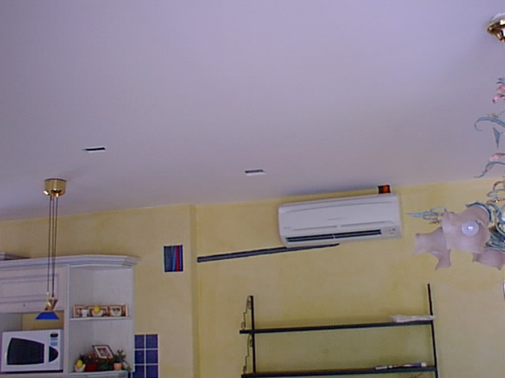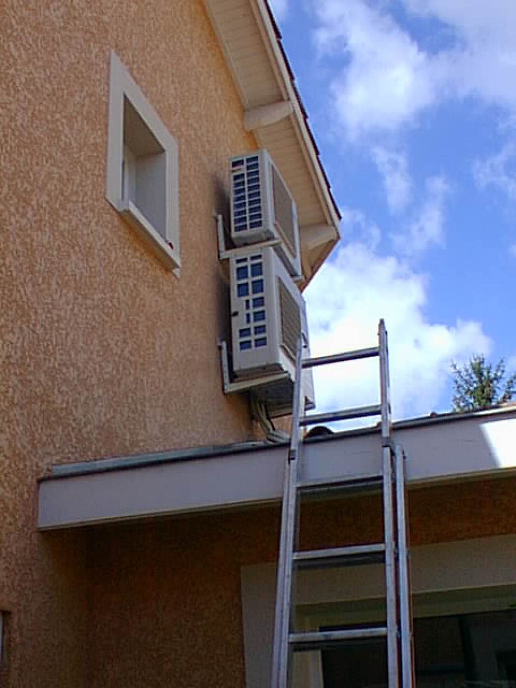 Climatisation et chauffage d'une villa en rénovation, incorporation dans les plafonds des tubes frigorifiques et liaisons électriques. Encastrement des vidanges. Les groupes sont installés à l'arrière de la maison au-dessus du toit du garage.