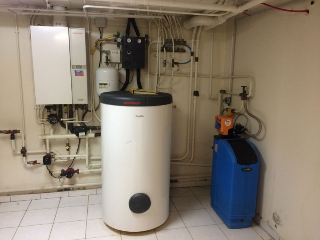 Installation dl'un chauffe eau CESI comprenant deux capteurs intégrés en toiture sur tuiles plates. Le ballon d'eau chaude de 300 litres stocke les calories gratuites du soleil. Par jour de mauvais la chaudière vient assurer la production d'eau chaude sur la partie haute du ballon de stockage. La protection intérieure contre le calcaire de tous les appareils sanitaires est assuré par un adoucisseur.