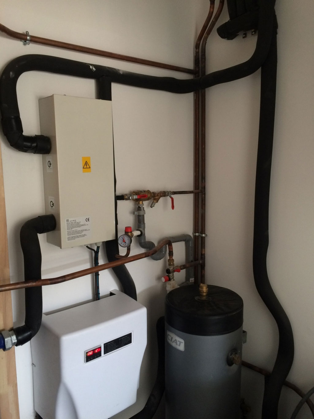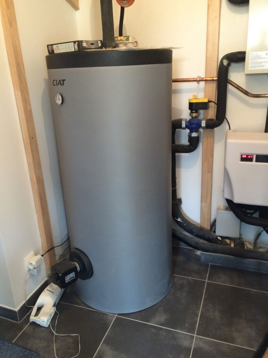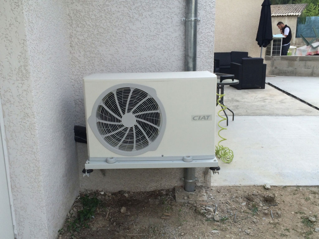 Chauffage par aérothermie d'une villa BBC (bâtiment basse consommation). La distribution de chaleur se fait au RDC par un plancher chauffant et à l'étage par des ventilos-convecteurs. L'été l'installation permet le rafraîchissement du RDC et la climatisation de l'étage.