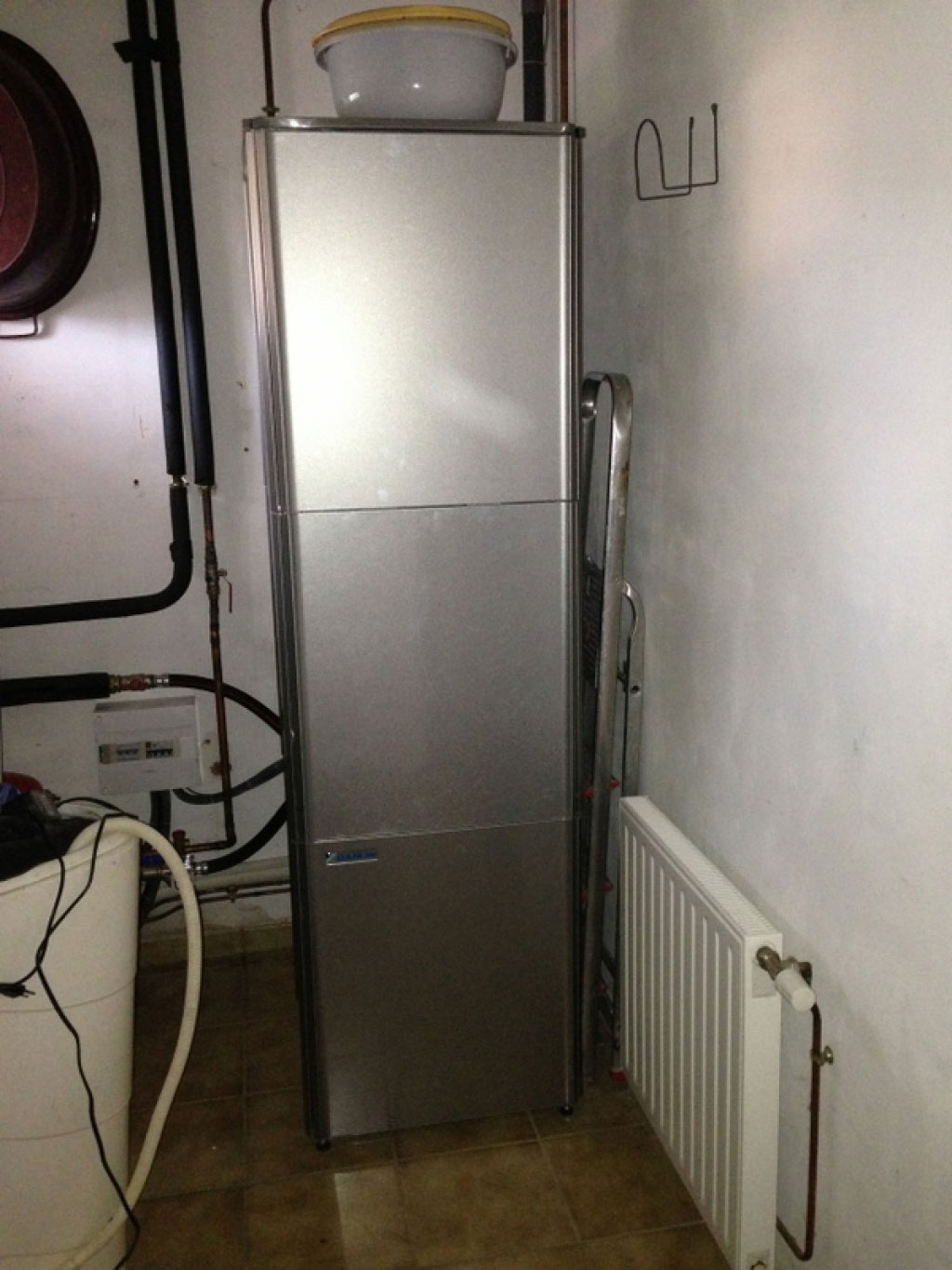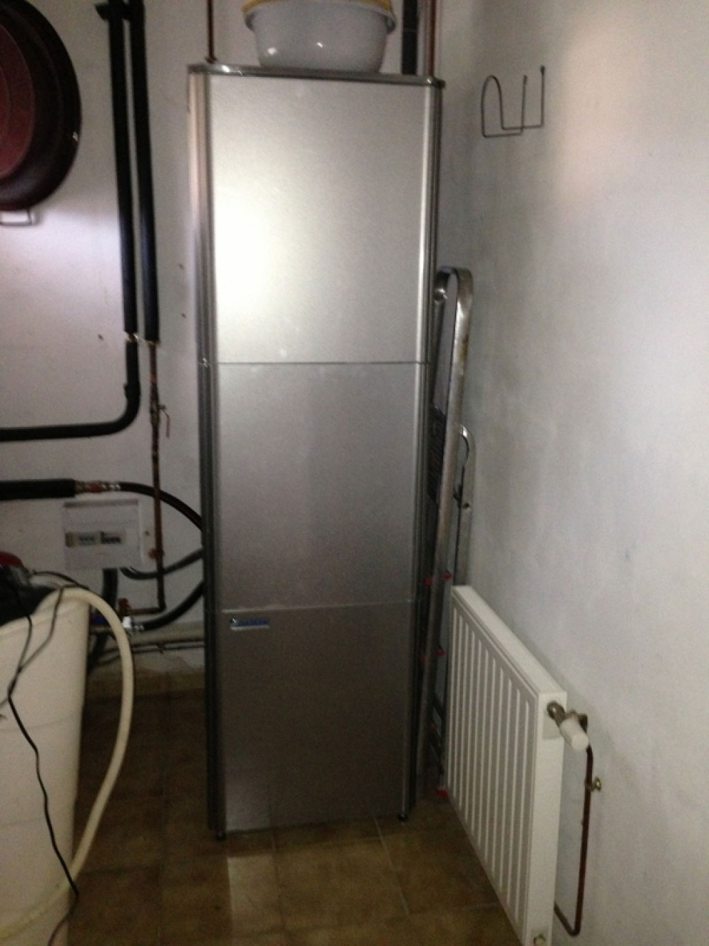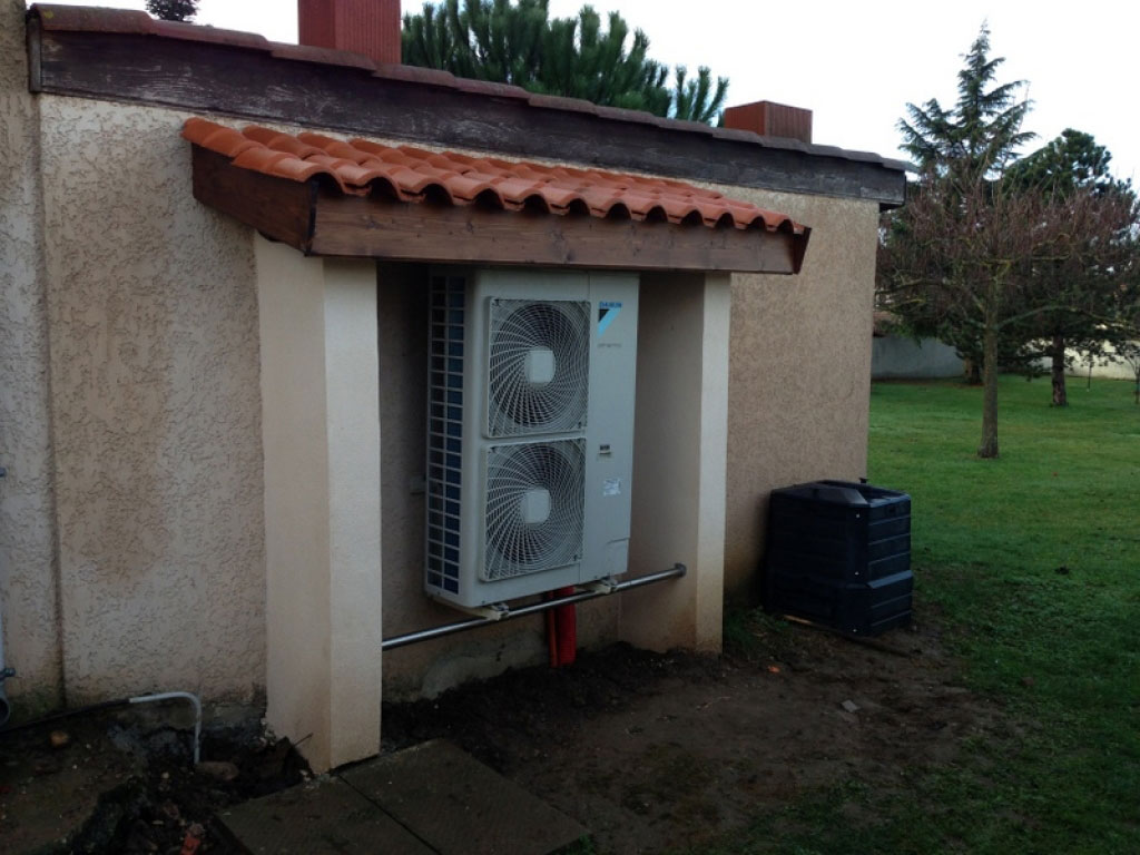 Pompe à chaleur aérothermie haute température (80°) installée sur un circuit radiateurs en fonte. Villa en pizay anciennement chauffée par un système chauffage central au Propane. L'installation a permis de réaliser d'importantes économies de chauffage et la pompe à chaleur assure aussi la production d'eau chaude sanitaire.