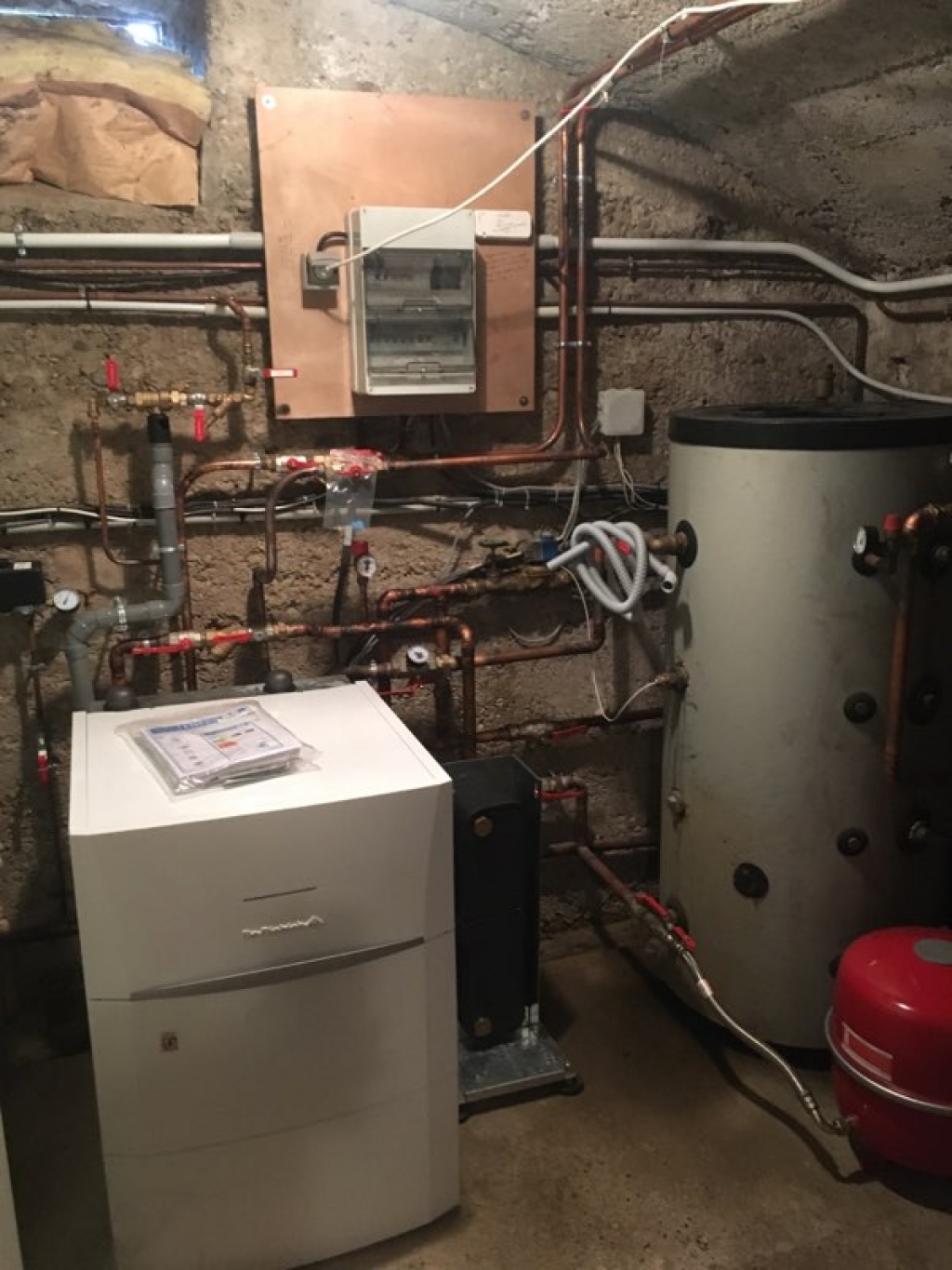 Installation d'une pompe à chaleur DE DIETRICH 15 Kw 380 v travaillant sur un réseau plancher chauffant et radiateurs JAGA (radiateurs basse température asservis avec un petit ventilateur).