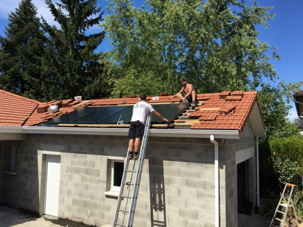 Installation en cours d'un champ de capteurs DE DIETRICH DIETRISOL PRO D 230 destiné au soutien en chauffage et production d'eau chaude sur un système combiné solaire.