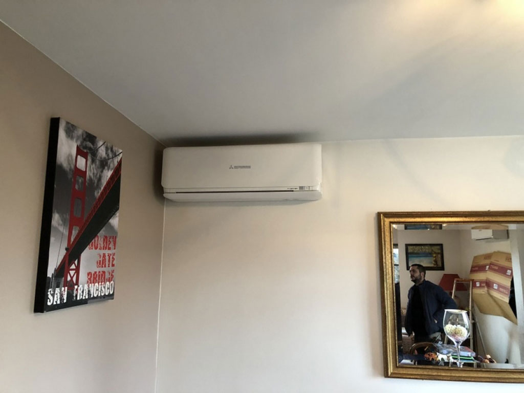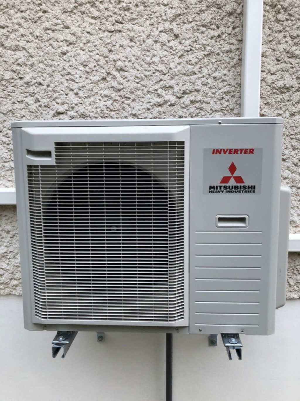 Installation d'une climatisation réversible de marque Mitsubishi compsée d'un groupe extérieur quadri-plit et de quatre unités murales série Performence.