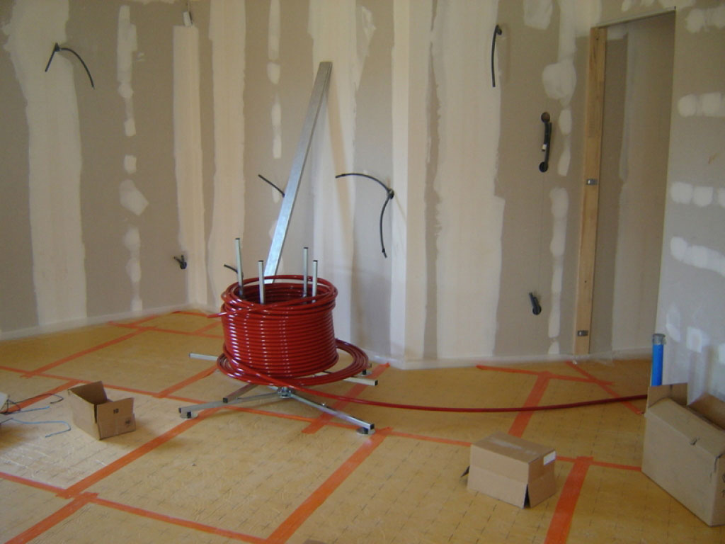 Installation d'un plancher chauffant rafraîchissant sur dalle plane isolante de 100 mm d'épaisseur.