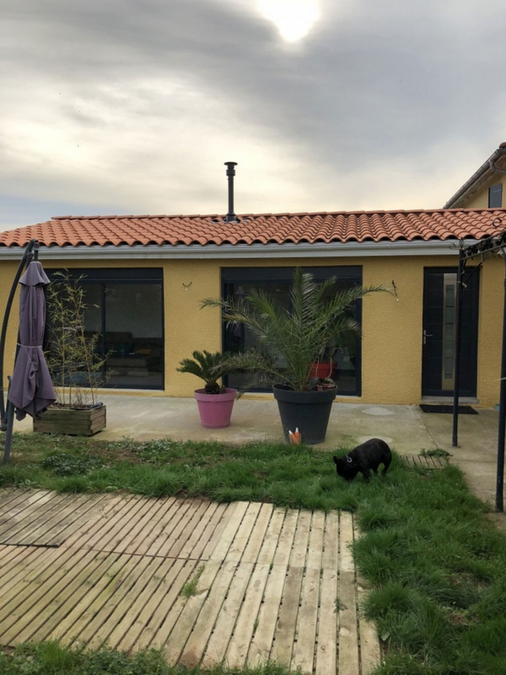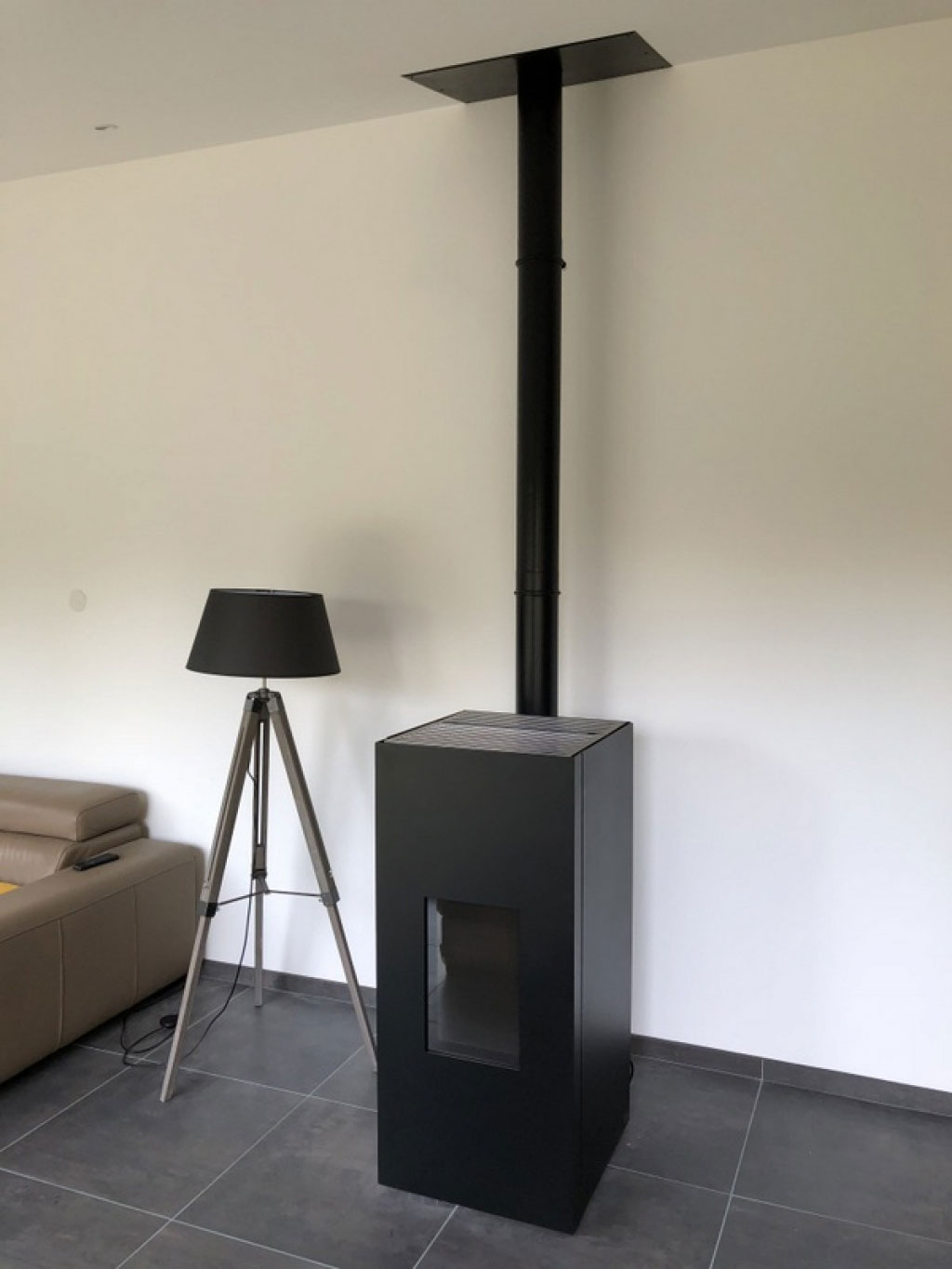 Installation d'un poêle à granulés de bois de marque MCZ modèle AIKE dans une extention. Le poêle permet, le chauffage, de gagné en confort et en économie. Il évite un chauffage électrique. Régulation, programation, par smartphone et gestion des ventillateurs.
