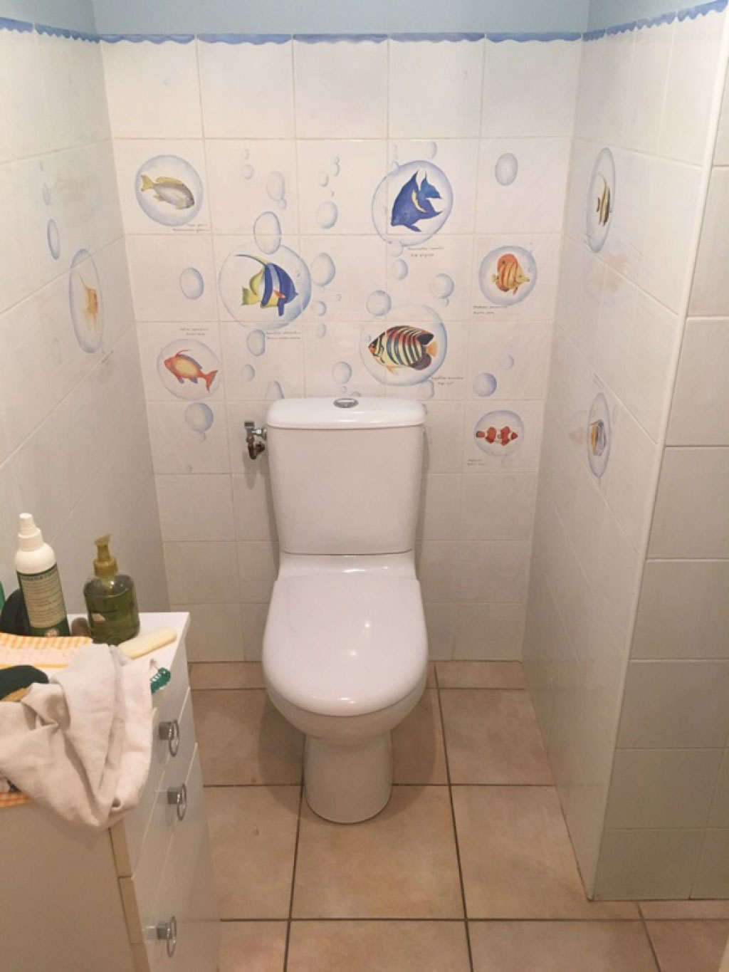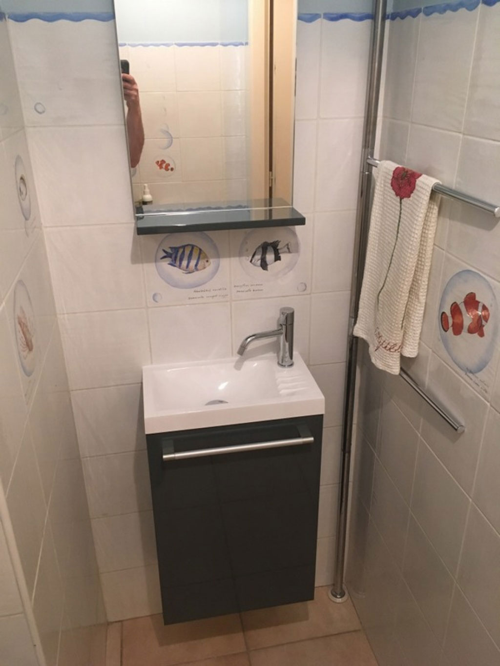Dans les toilettes nous avons remplacé le WC et installé un lave-mains et un miroir pour plus de commodités.