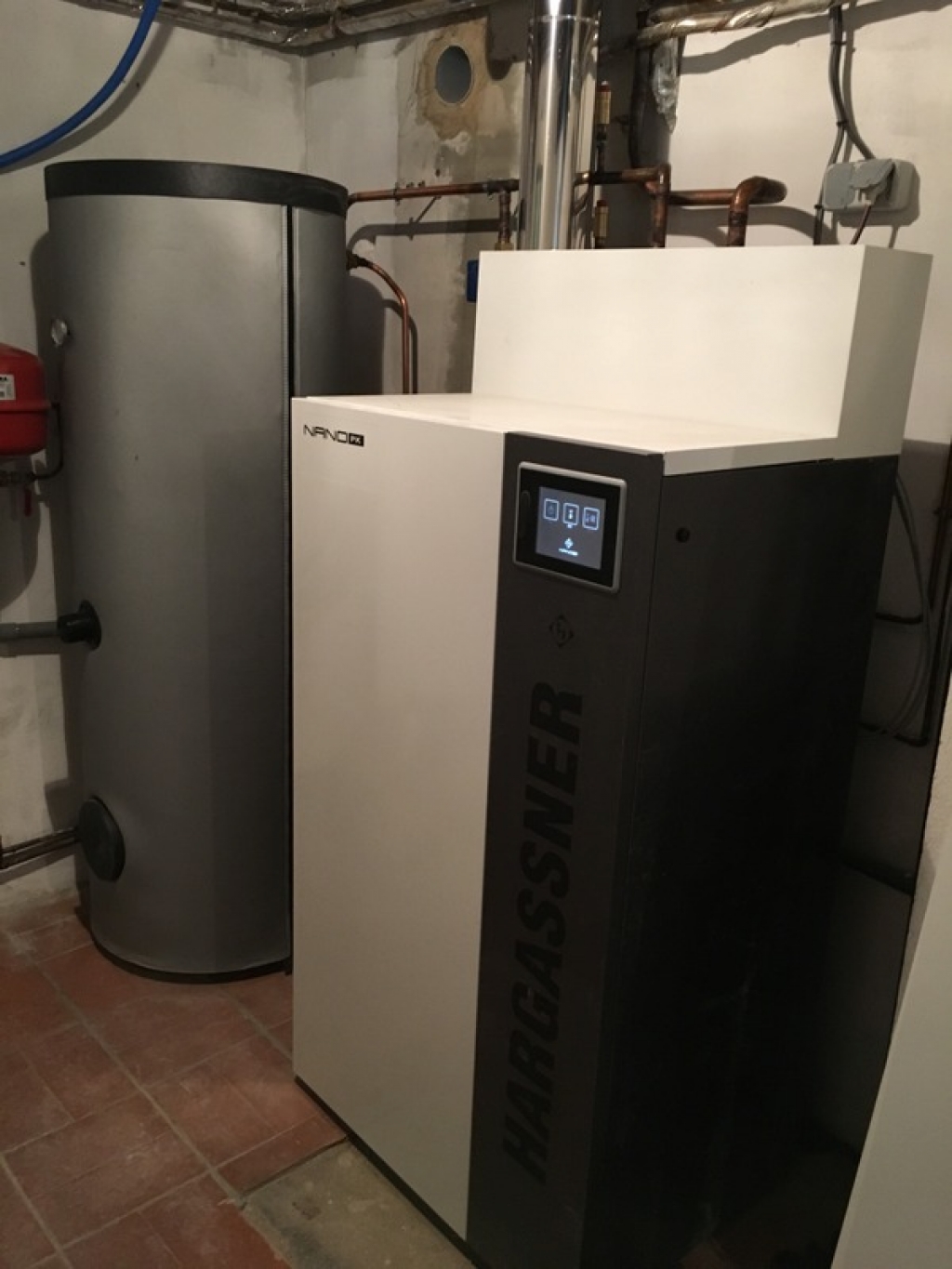 La chaudière Nano Hargassner est prévue pour un fonctionnement d' approvisionnement de granulés automatique. Pour l'instant notre client charge manuellement le silo intermédiaire intégré d origine à la chaudière. le raccordement à un silo maçonné ou textile est prévu dans le futur.