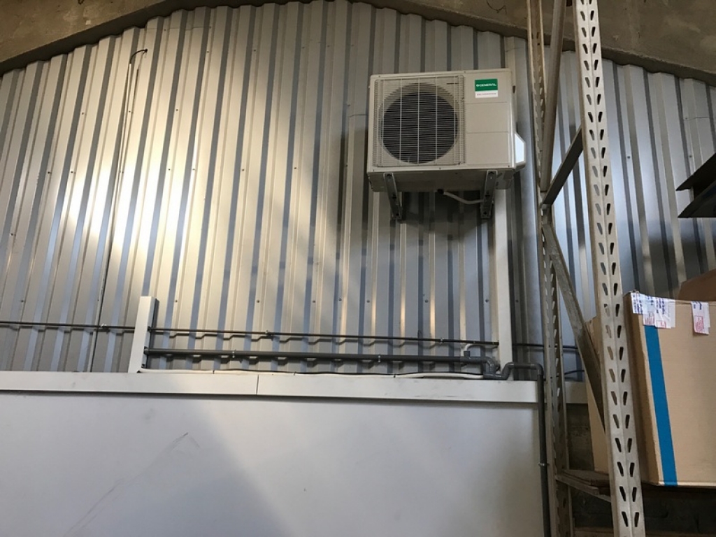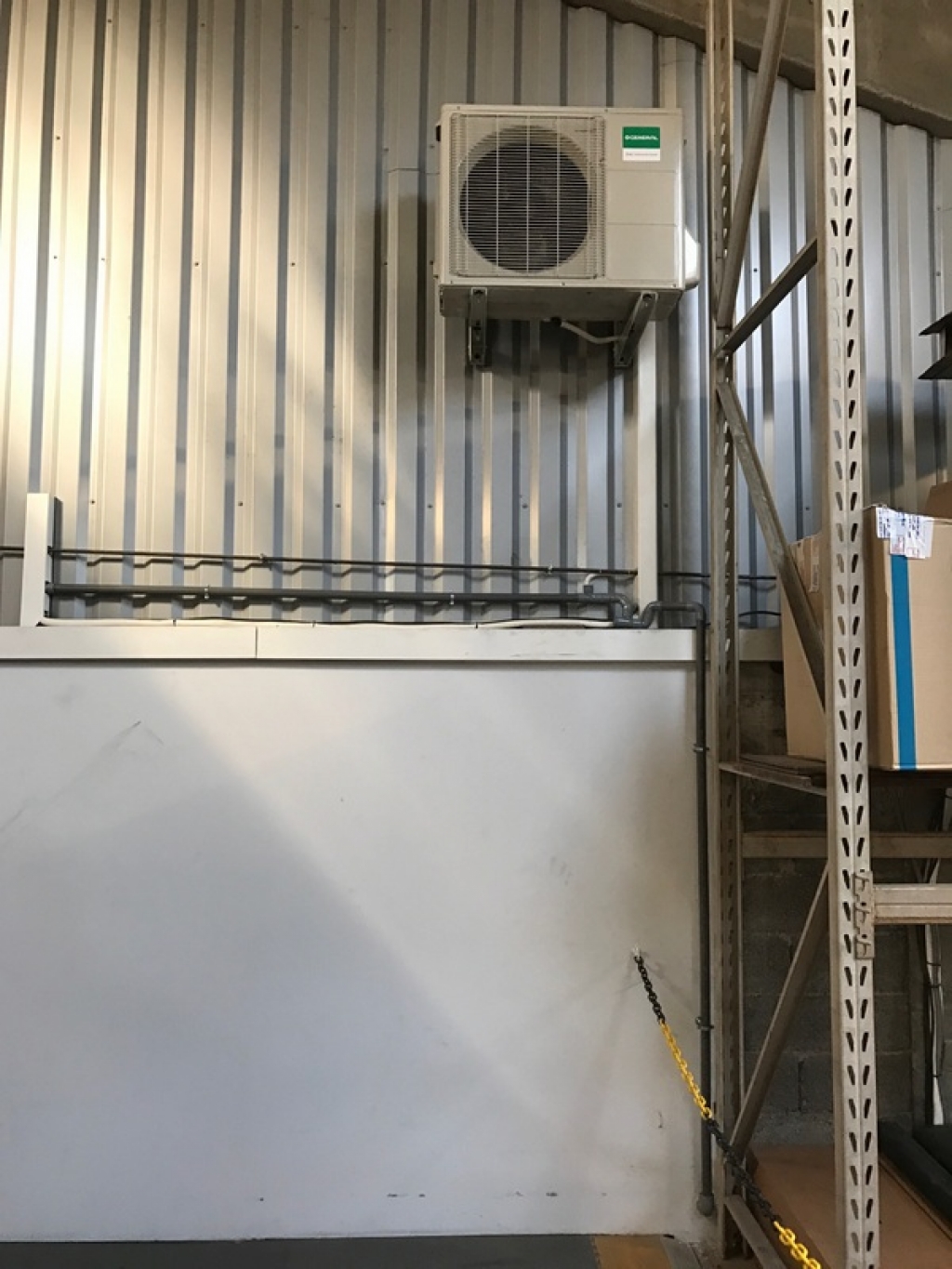 Installation d'une pompe à chaleur air/air pour le chauffage et la climatisation d'une salle de réunions dans un bâtiment industriel.