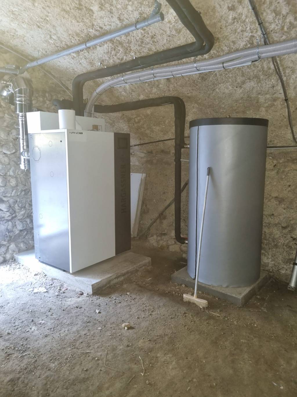 Installation d'une chaudière à granulés bois de marque hargassner avec son silo textile