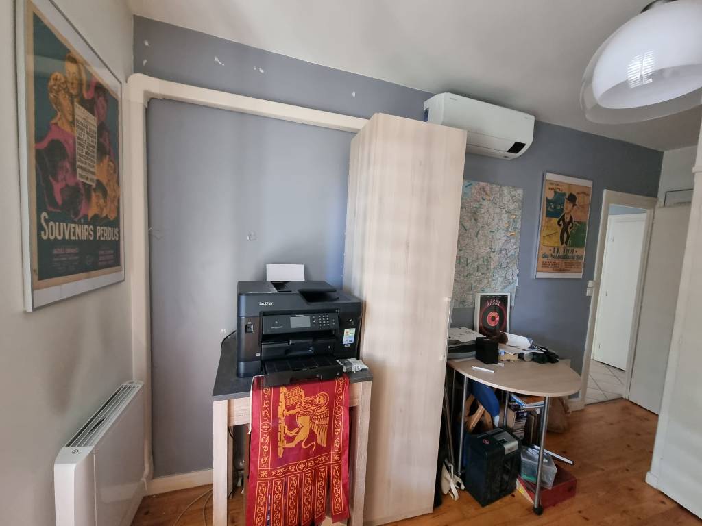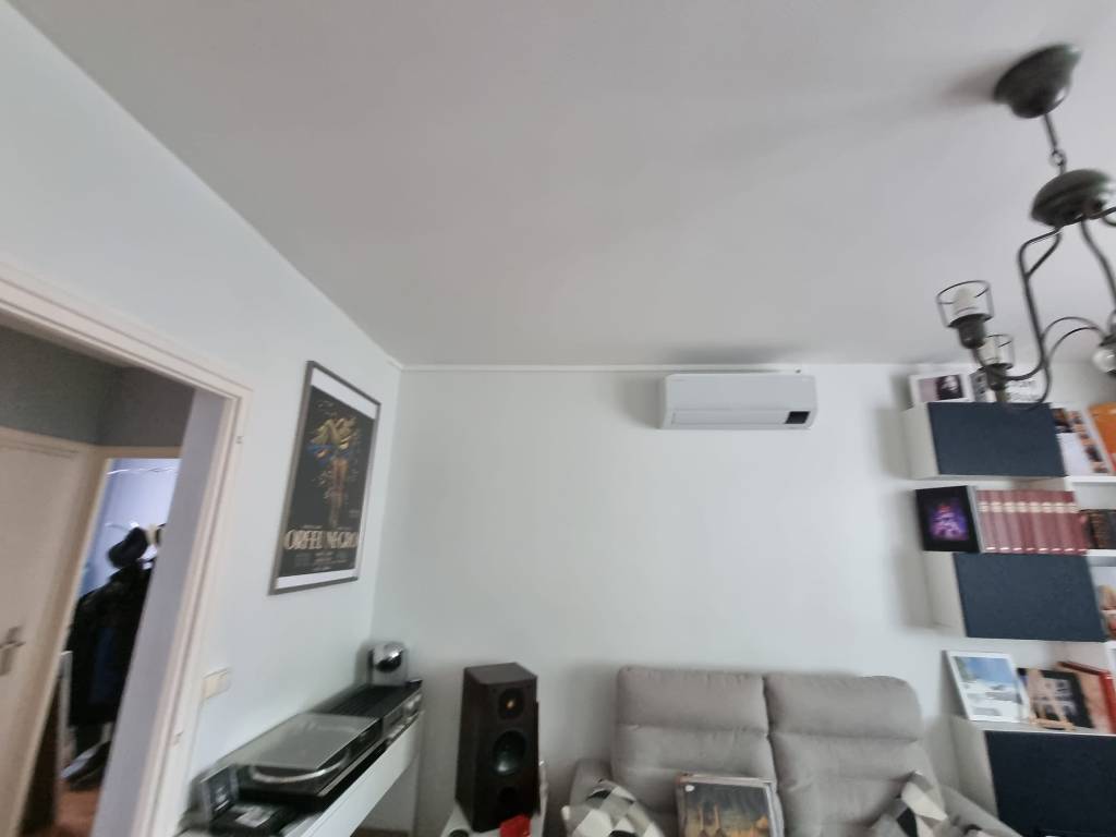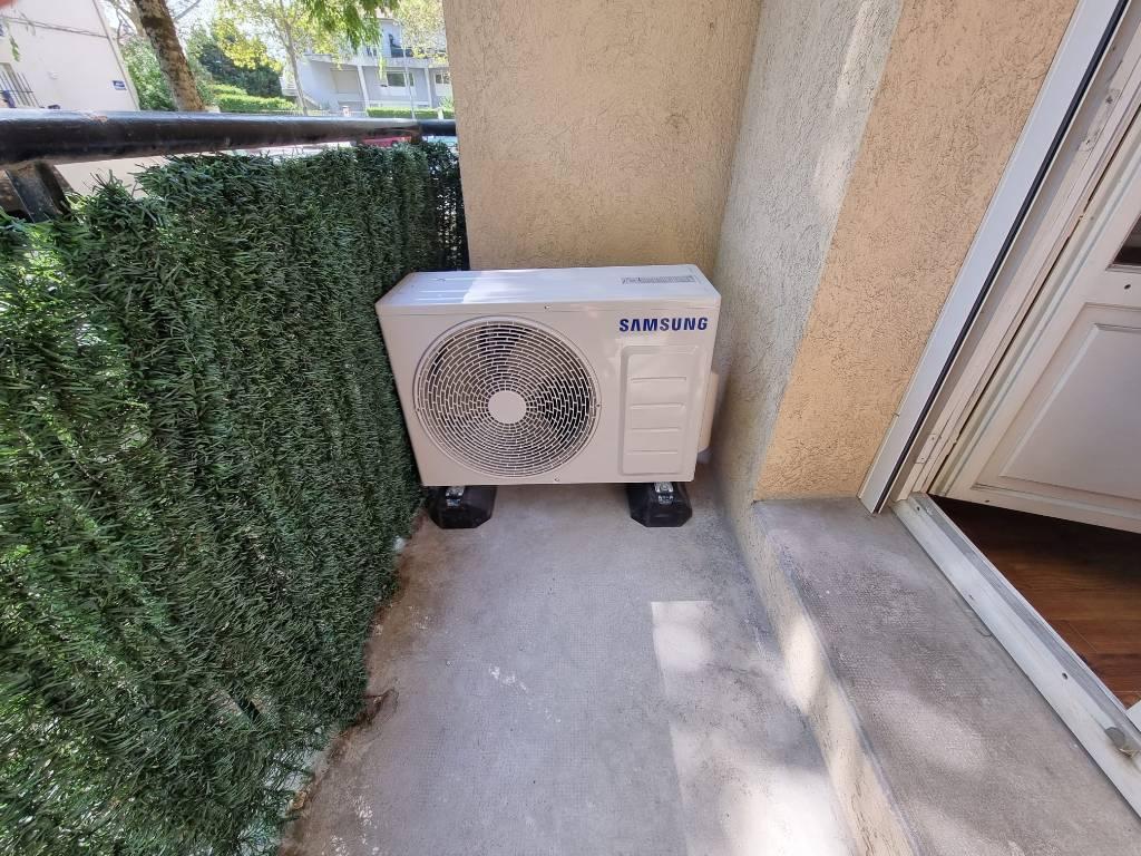 Installation dans un appartement sur Lyon d'une climatisation Bi Split avec deux unités intérieures pour une chambre et un salon d'une puissance de froid de 2 KW et 3,5 KW de marque Samsung modèle Wind Free Confort et pose du groupe extérieur sur le balcon avec l'autorisation de la copropriété de l'immeuble.