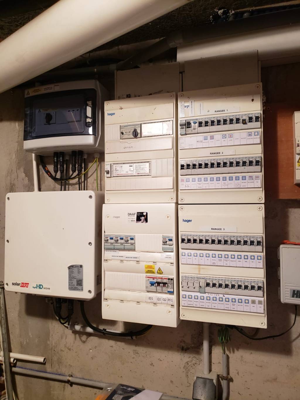 L'installation se compose de trois champs de 21 modules de 430 watts crête est et sud, avec 21 optimiseurs S500B et un onduleur Solaredge triphasé de type SE8K.