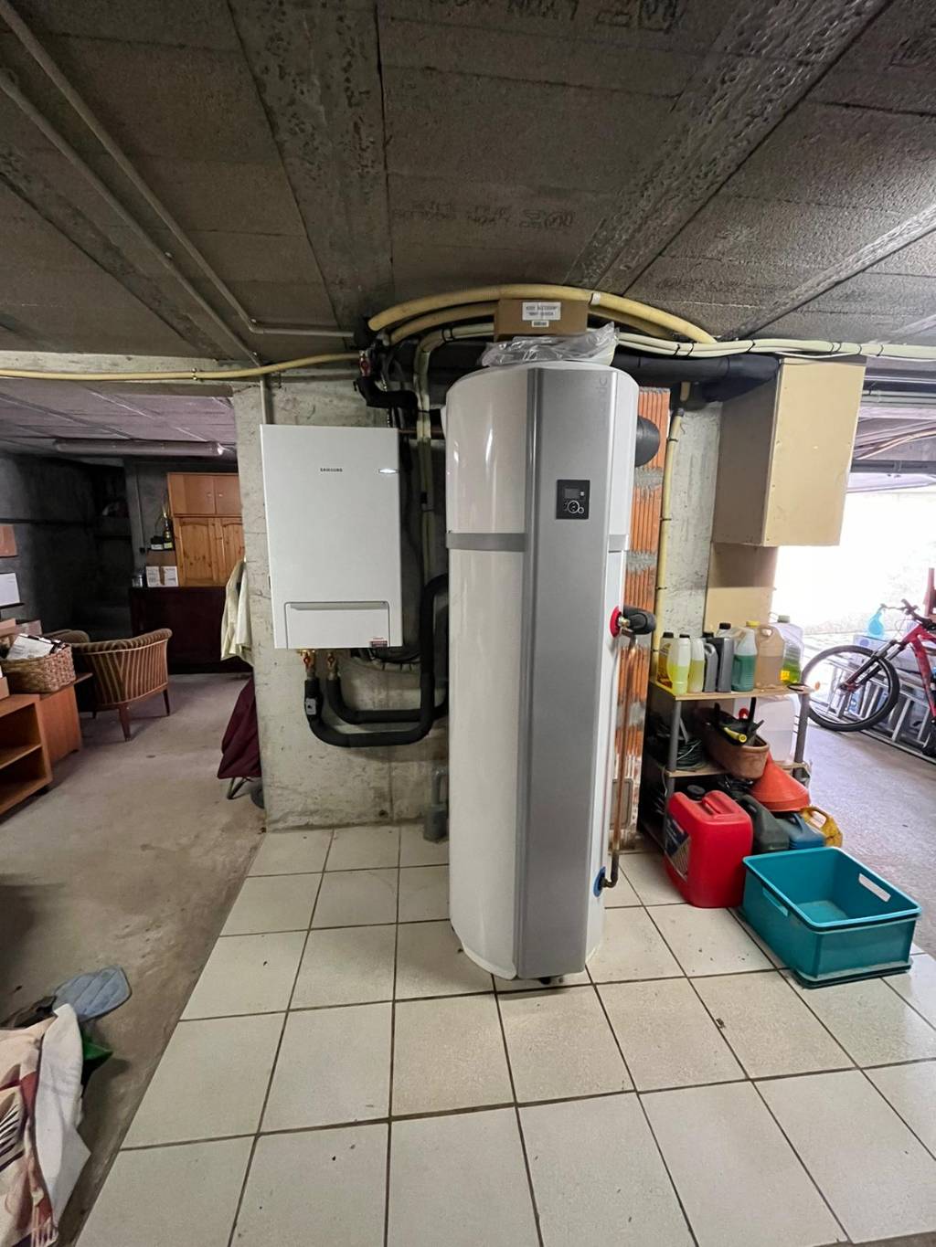 Remplacement d'une chaudière fioul, dans le cadre de la transition écologique par une pompe à chaleur Samsung, sur un plancher chauffant et un ballon thermodynamique Atlantic.